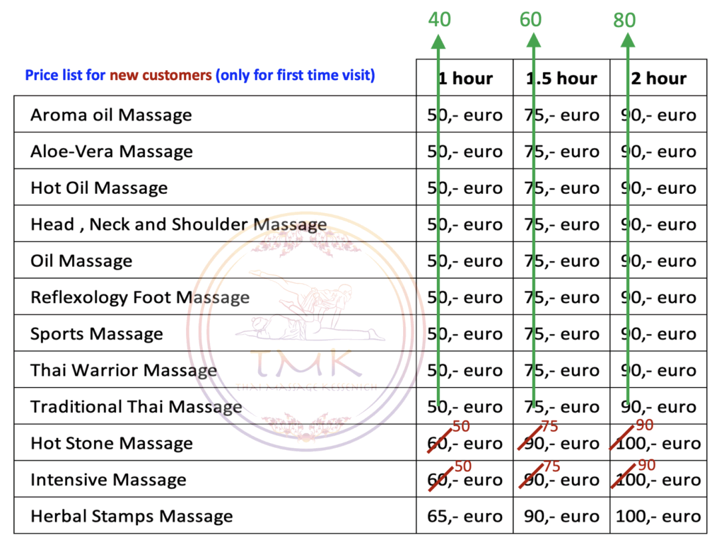 For the very first massage, we offer you a one-time discount on the original prices according to the table below.